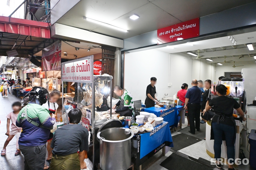 興興海南雞飯的地理位置真的非常棒,就在曼谷最熱鬧的Sukhumvit區,距離BTS Phrom Phong站步行就能輕鬆抵達!這點對於自助旅行的朋友來說,真的是超級加分啊。搭乘BTS到Phrom Phong站後,興興海南雞飯 Heng Heng Chicken Rice位於Emporium附近差不多Sukhumvit 24巷的方向。興興海南雞飯店面不大,紅白色招牌和門口掛著的雞肉,還有絡繹不絕的在地客,都非常顯眼,你絕對不會錯過喔!