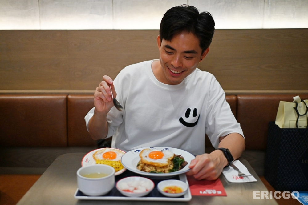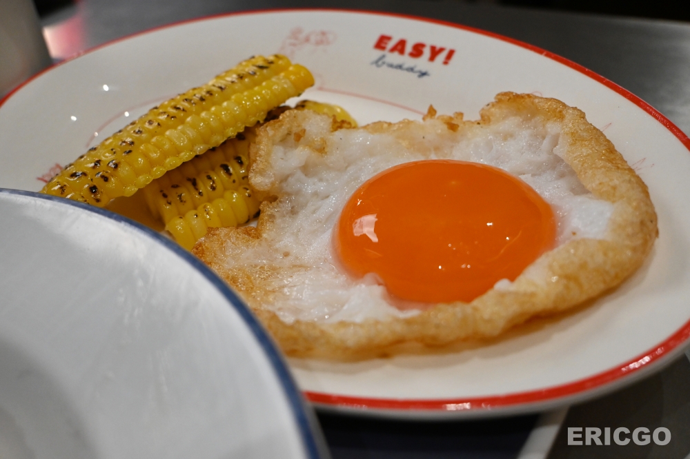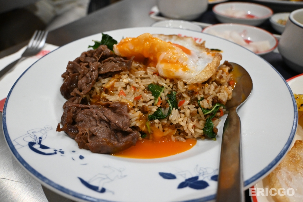 而那個焦糖玉米荷包蛋,玉米的清甜與焦糖的香氣,竟然與打拋飯的鹹辣達成了不可思議的平衡,創造出多層次的味覺體驗,甜、鹹、辣、香在口中交織,非常好吃非常厲害!旁邊附的醃蘿蔔也相當解膩,讓整份餐點吃起來更清爽。