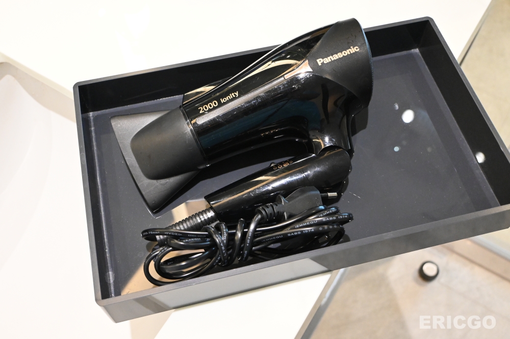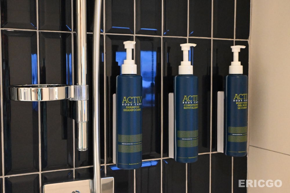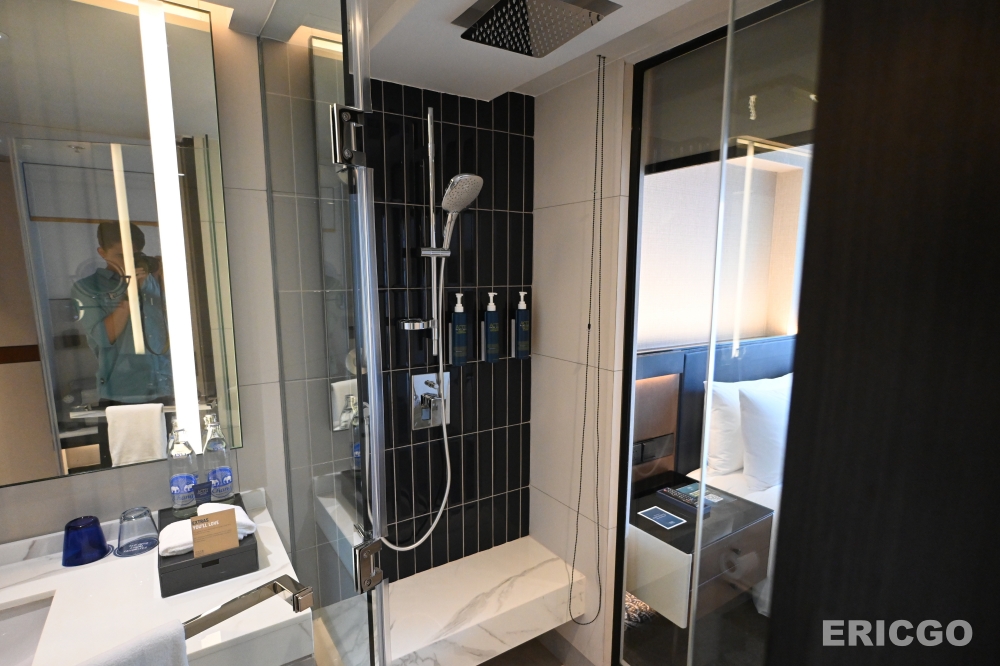 乾濕分離浴室設計,備有吹風機、大瓶裝沐浴備品、獨立淋浴空間。