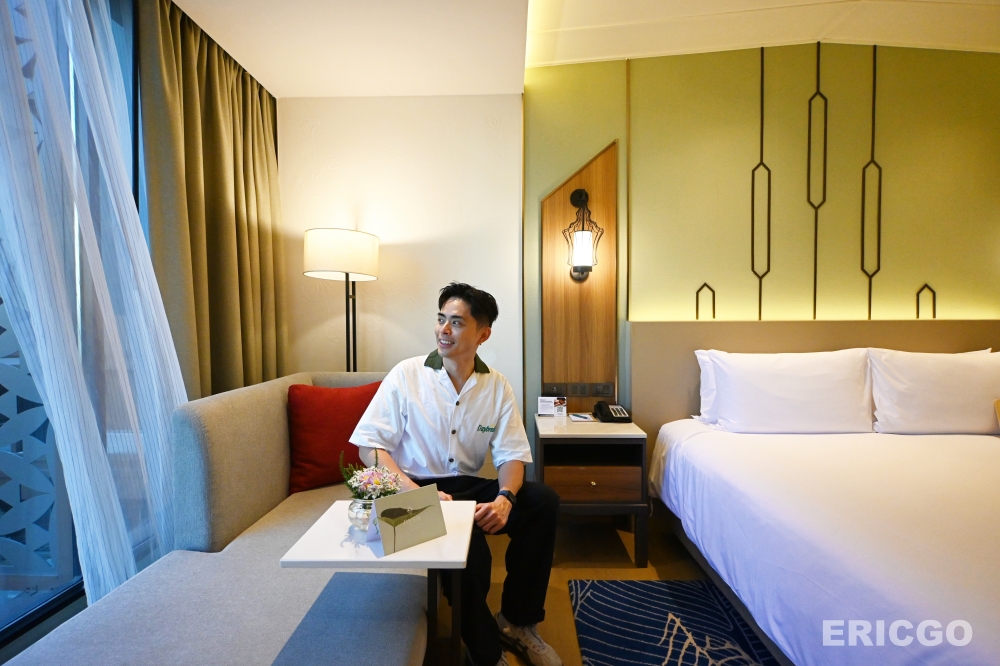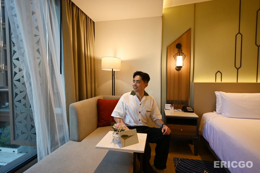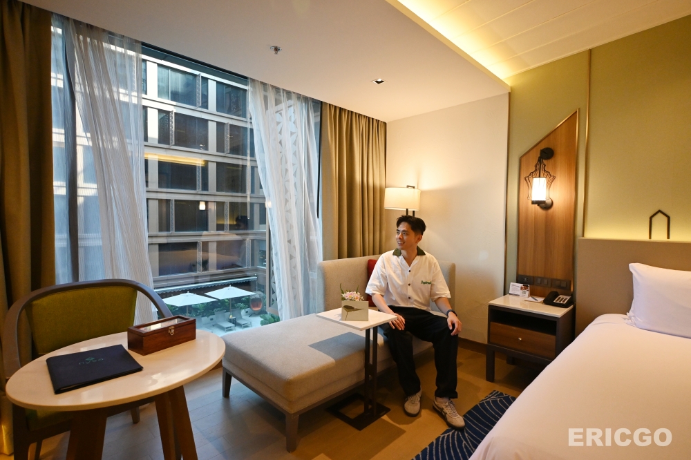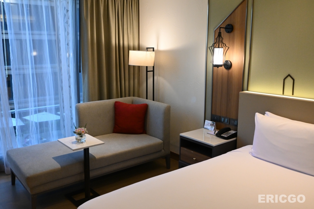 客房採用現代簡約風格,搭配泰式元素點綴,營造出溫馨而有質感的氛圍。King Size大床軟硬適中,提供極致的睡眠體驗。床邊設有充足的插座,方便充電。(Agoda優惠房價查詢