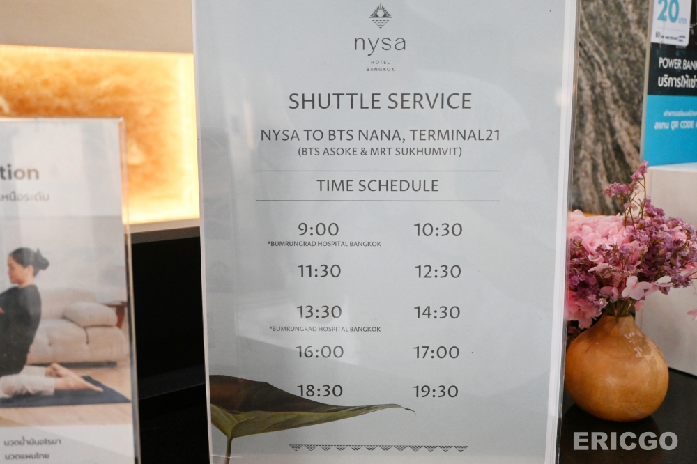 Nysa Hotel Bangkok Sukhumvit 11 免費接駁車,往返於飯店與BTS Nana站、Terminal 21(BTS Asoke站及MRT Sukhumvit 站)。上圖為接駁車由飯店出發時間,大家可自行抓一下時間,請務必現場再次確認。