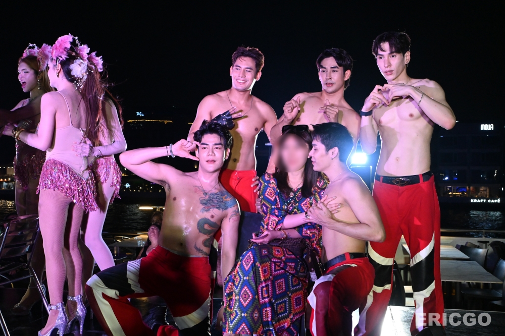 Riverside Carnival Cruise河畔嘉年華遊輪壓軸好戲來啦!!!!這絕對是讓現場氣氛瞬間沸騰的環節,一群充滿肌肉線條、活力四射的泰國猛男,帶來一系列充滿力量與熱情的舞蹈表演。他們與觀眾的互動非常熱絡,會邀請觀眾一同跳舞,甚至還有一些「福利」環節,讓現場氣氛嗨到最高點,跟人妖一起表演的爆發力與娛樂性十足!!一樣可以跟他們拍照,記得給小費。千萬不要暈船了啊哈哈哈!