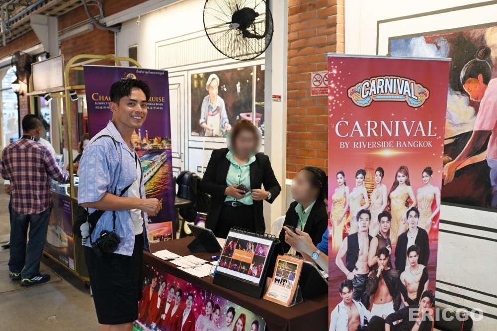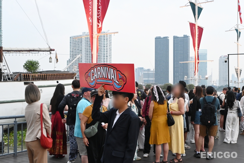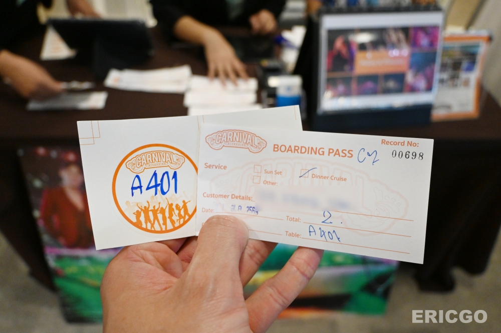 找到Riverside Carnival Cruise河畔嘉年華遊輪在7號倉庫(Asiatique Warehouse no.7)的報到櫃檯,出示電子憑證兌換實體船票,再到1號碼頭準備登船。現場都會有工作人員會引導登船,整個過程都非常簡單,無須擔心。