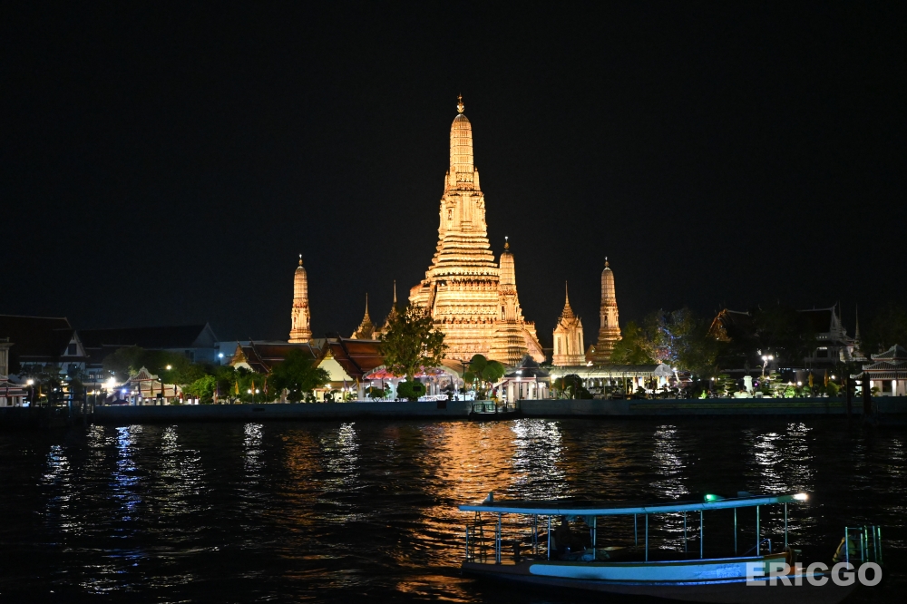 遠近馳名的鄭王廟 (Wat Arun),佛塔在夜間被金色的燈光照亮,顯得格外神聖莊嚴,是拍照的絕佳背景。