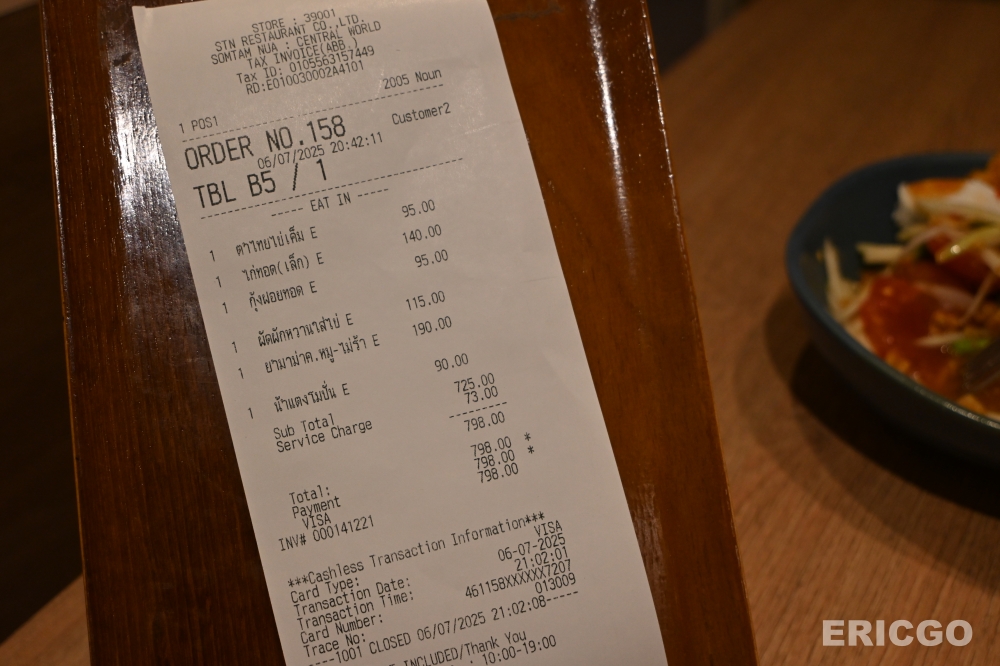 Somtam Nua的價格在曼谷餐廳來說,我覺得算是蠻親民,價格很合理!一份青木瓜沙拉平均落在100泰銖左右,炸雞一份也大概是140-180泰銖,其他菜色也都在合理的範圍內。我們兩個人去吃,點個三四道菜,加上飲料,一個人通常都不會超過500泰銖,真的超級划算的。用這個價格能吃到這麼道地又好吃的泰國菜,我覺得非常值得!如果你想在曼谷花少少的錢,就能吃到超滿足的泰國菜,那Somtam Nua絕對是你的最佳選擇。