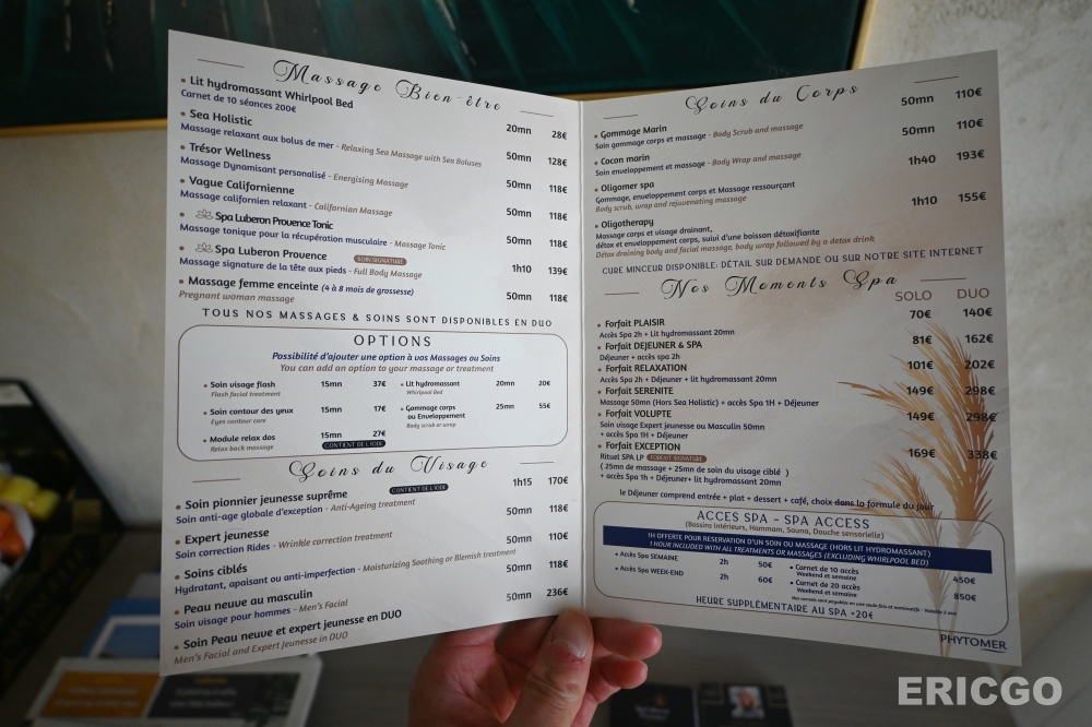 旅行途中難免會有些疲憊,這時候 Spa Luberon Provence 就是你的救星了!這個水療中心設施蠻齊全的,有室內溫水泳池、土耳其浴、桑拿,還有各種專業的按摩和護理療程。需另外付費。