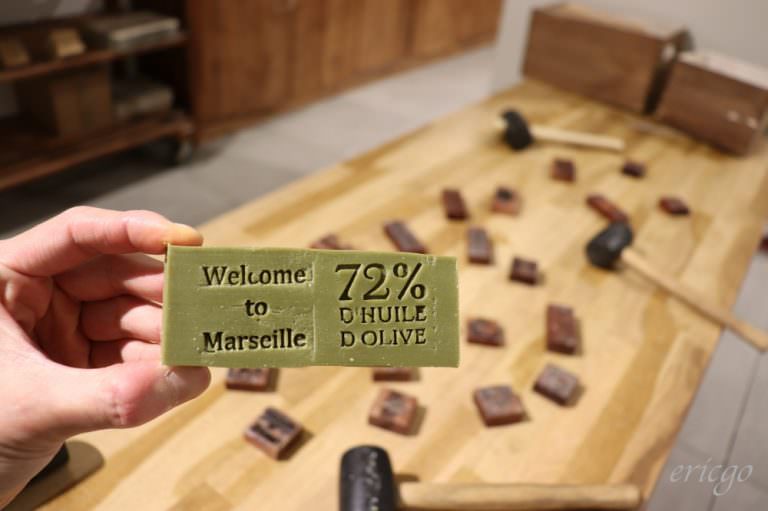 說到馬賽皂,一般人只知道這是馬賽的特色,由72%的橄欖油所製成,沒有香精、無色素,無人工添加物或化學成分。馬賽皂的用途相當廣泛,除了洗臉外,還可以洗頭、洗身體,成分天然全身都可以用!在可愛的解說員介紹後,我才知道原來馬賽皂72%是橄欖油、8%是蘇打,剩下的 20%就是水。然後,綠色的馬賽皂是洗身體用的,而米色或白色的馬賽皂是洗衣服用的啊!