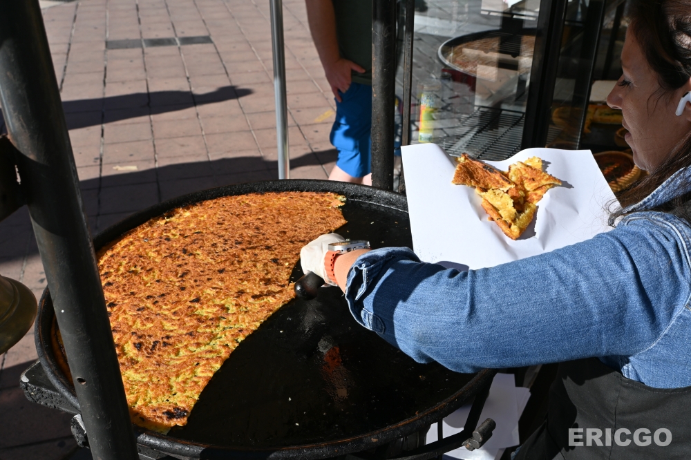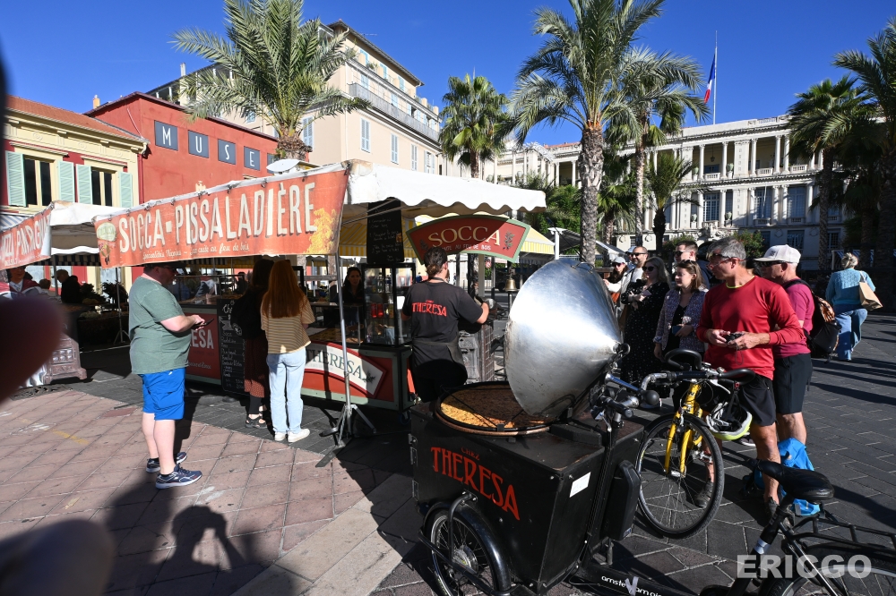 這裡最吸引人的,還有那股撲鼻而來的香氣,尼斯國民小吃Socca!這一家知名老店Chez Thérésa每天早上會來市集擺攤,熱騰騰出爐一定要試試看!Socca是一種由鷹嘴豆粉製成的薄餅,在特製的大烤爐中烘烤至金黃酥脆。它外層微焦,內裡軟糯,帶有淡淡的豆香和焦香,一份3歐平價美味到讓人驚艷!通常會用一大張紙包著,趁熱吃超好吃!
