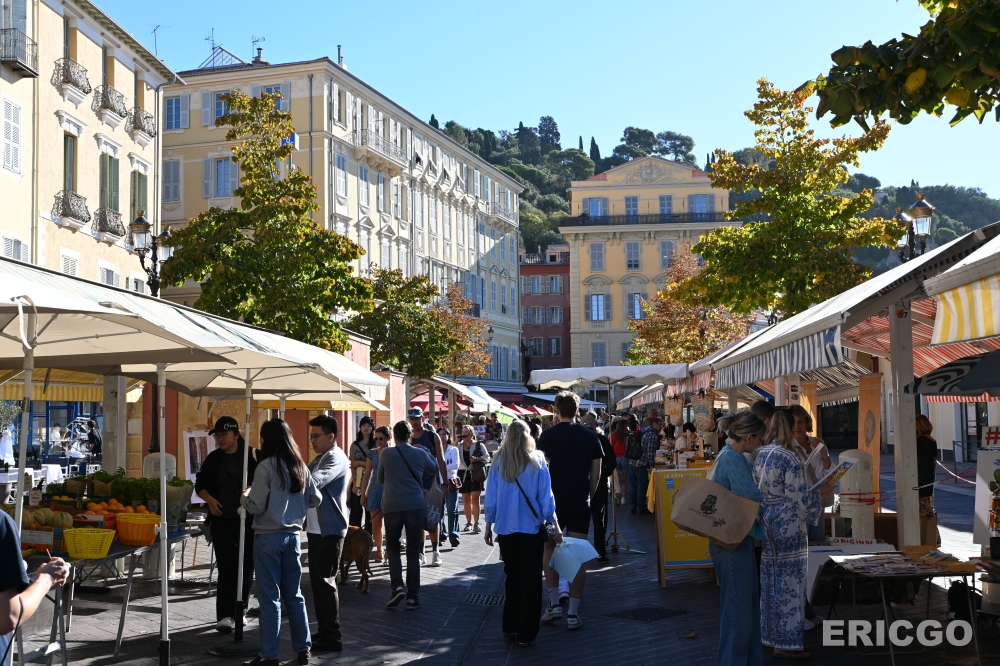 既然來到了尼斯老城區,就絕對不能錯過每天早上充滿活力的Cours Saleya廣場市場!這個市場不僅是鮮花、蔬果和手工藝品的集散地,更是品嚐尼斯地道小吃的最佳地點。市場裡色彩繽紛的鮮花攤位,散發著迷人的芬芳;新鮮的蔬果、橄欖油、香料,讓人目不暇給。