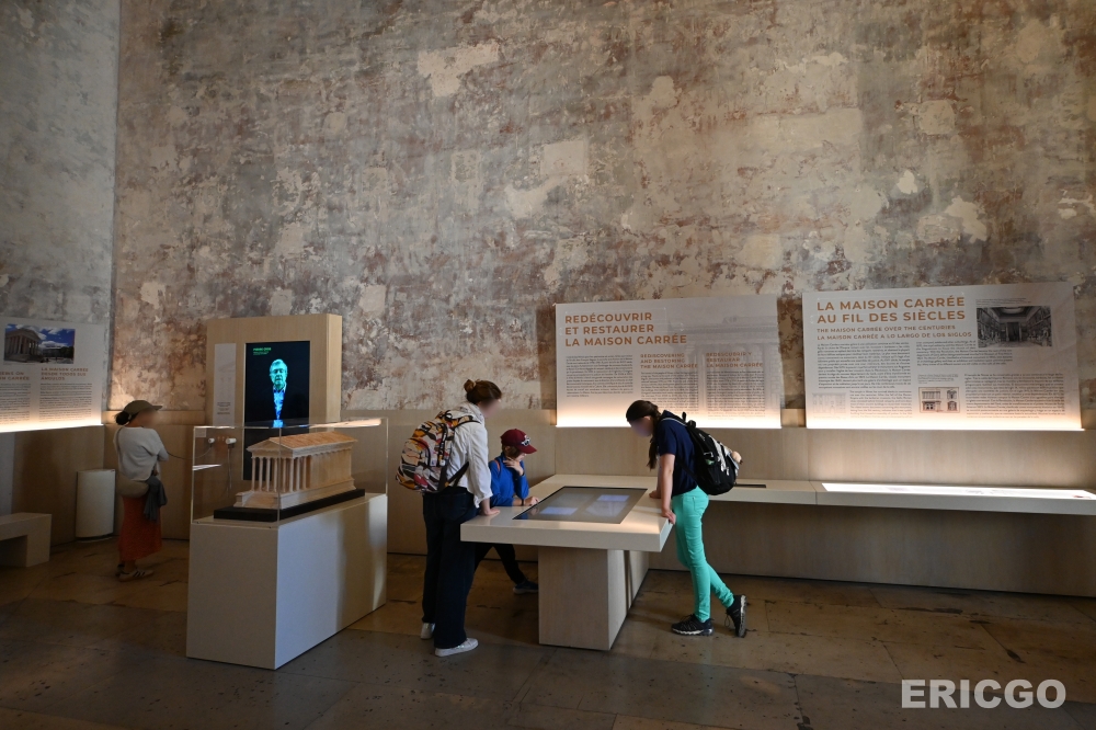 與許多古羅馬神殿內部空曠的空間不同,Maison Carrée的內部空間經過現代化改造,以簡單的文字及影音方式講述了尼姆的古羅馬歷史,及Maison Carrée在不同時期所扮演的角色。雖然影片內容並非實體文物展覽,但透過視覺和聽覺的導覽,讓遊客能更簡單了解尼姆與古羅馬的連結!