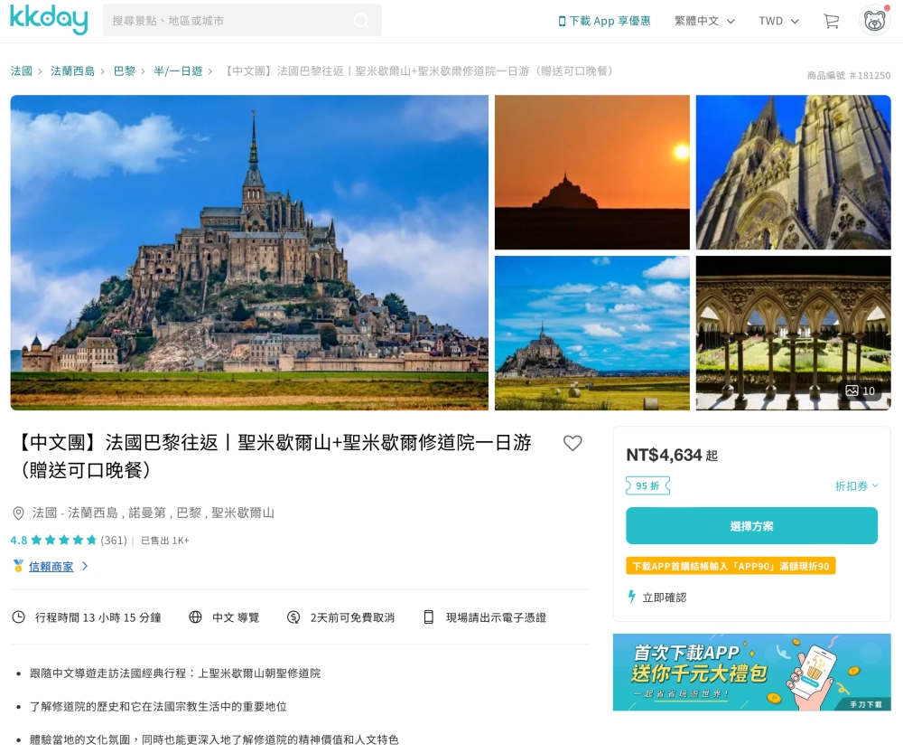 - 優惠資訊:法國商品不限低消享 95 折,最高折抵 300(部分商品不適用,請依照 KKday 商品頁顯示是否適用本折價券為準)