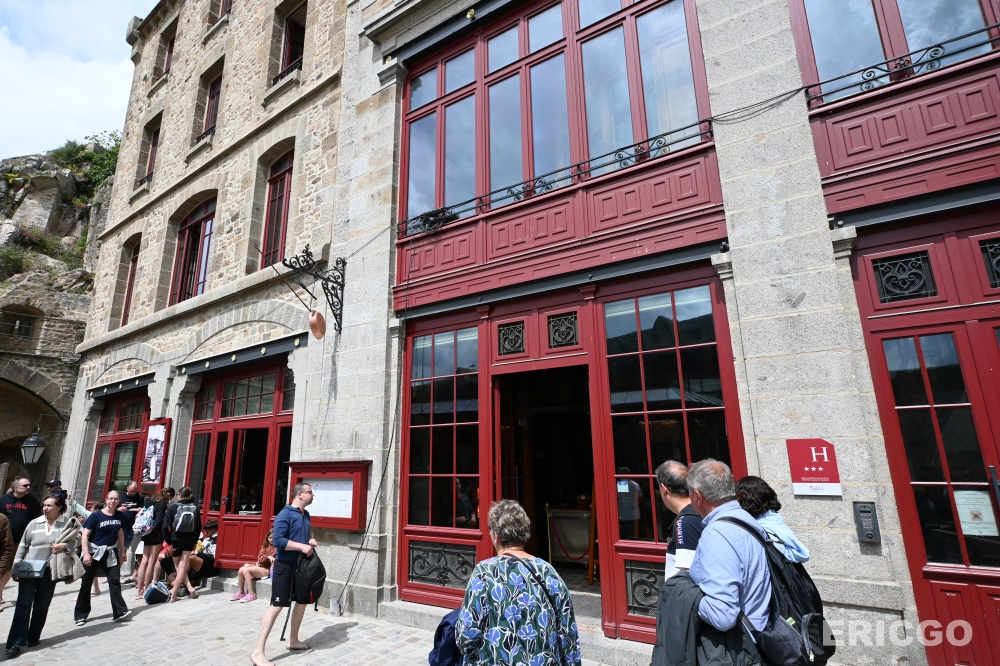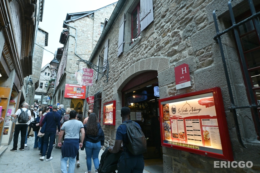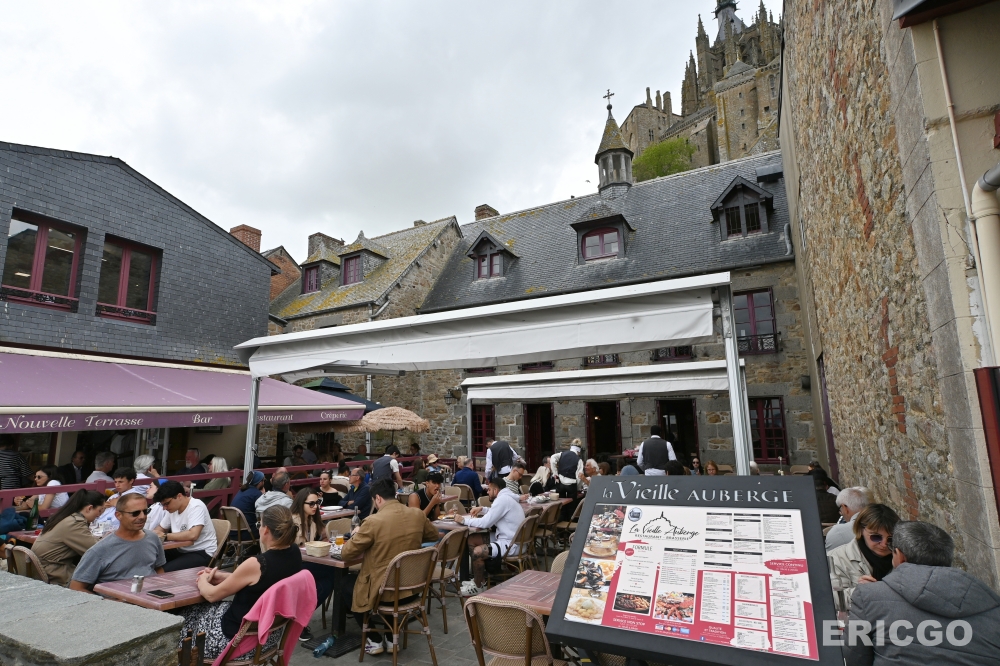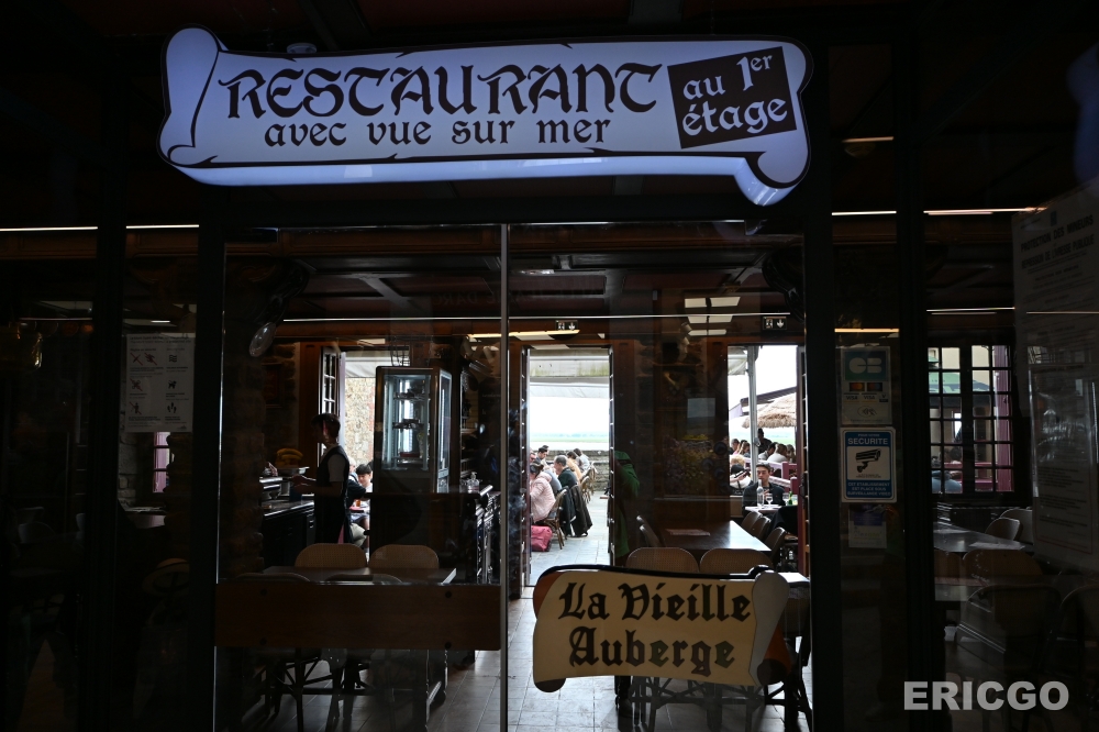 下面這一家La Vieille Auberge是我當天觀察到生意極好座無虛席的一家餐廳,地理位置剛好位在大街上,露天座位陽台座位區面對海景,雖然我查了一下餐廳評價欠佳,但坐擁聖米歇爾山絕美景觀還是吸引超多遊客來喝飲料休息一下。La Vieille Auberge本身也是一家旅館(Agoda房價查詢),真的想在聖米歇爾山住上一晚,也可以參考看看喔!