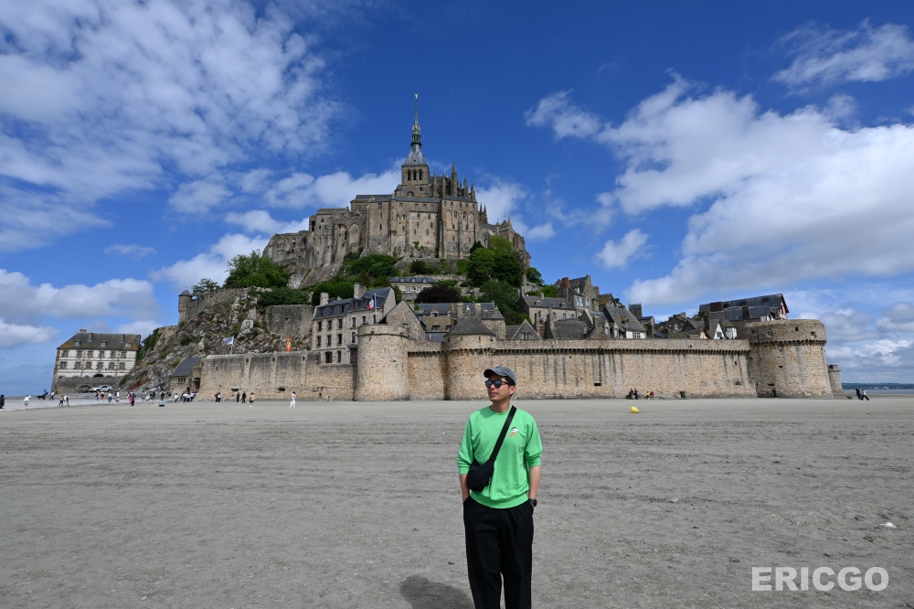 上面是周杰倫《倒影》MV一直出現的經典角度,就是趁著退潮的時候走到沙灘上拍攝整座壯闊的聖米歇爾山!當天運氣很好,抵達時出了大太陽,聖米歇爾山搭配藍天白雲真的非常漂亮,名符其實的天空之城!下面則是另一個周杰倫周董也拍過的拍照角度。