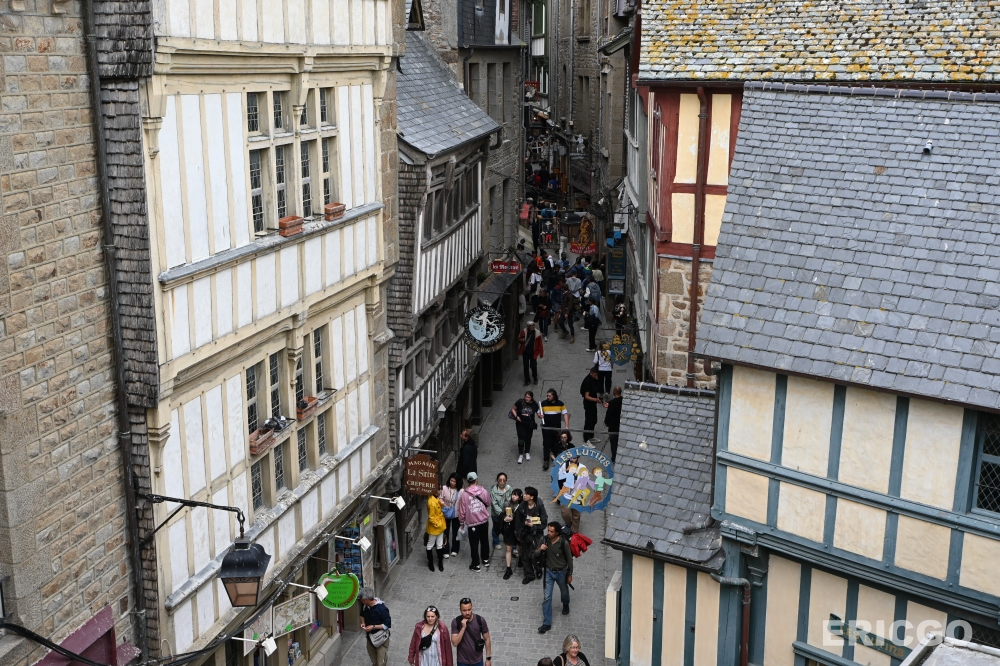 La Grande Rue大街為主要的街道,往上前進就能抵達聖米歇爾山頂上的修道院,沿途揭示保留中世紀風格的建築,整體蠻熱鬧有蠻多餐廳及紀念品店,但大多數偏觀光性質,當天逛下來覺得整體沒有什麼太特別的店家。