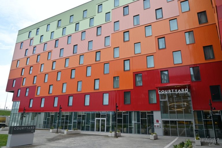 接下來就是兩合一的Courtyard by Marriott 跟Residence Inn,兩家都是Marriott旗下於2022年底新開的機場住宿選擇,同一棟建築以兩種極端的色彩區別,灰階的Residence Inn及色彩繽紛的Courtyard by Marriott。