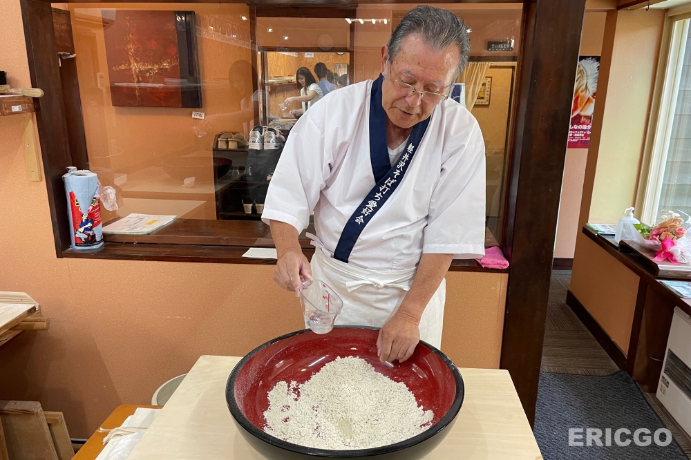 首先,準備好蕎麥麵粉,以及純淨的輕井澤水源,蕎麥麵粉與水的黃金比例都幫大家準備好了。需要用雙手將麵粉與水緩慢混合,從鬆散的粉末逐漸變成濕潤的顆粒狀。這個步驟需要耐心與細心,確保每一粒麵粉都能充分吸水。