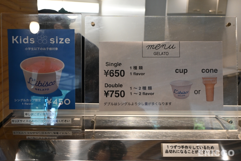 你可以選擇單球、雙球,使用杯子或是搭配餅乾筒享用,單個口味日幣650,雙口味日幣750,小朋友尺寸一口味日幣450。