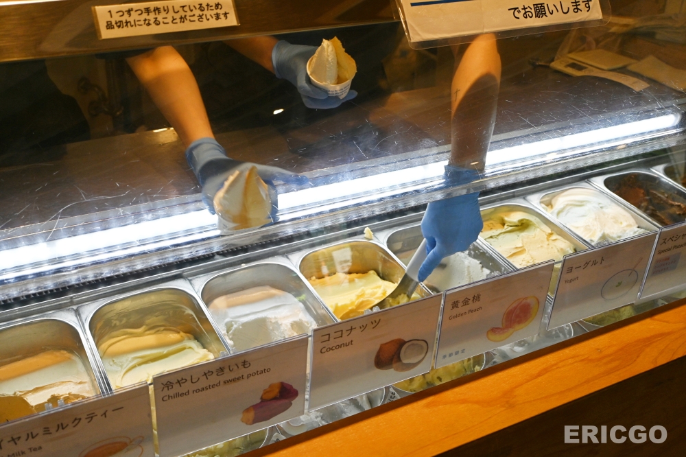 除了最景點招牌的牛奶口味,這次造訪 L’ibisco,我選擇了兩種口味:「Golden Peach黃金桃」、「Yogurt優格」。輕井澤水果非常有名,我都會特別留意他們的季節限定水果口味,因為那是最能體現 L’ibisco 對新鮮食材堅持的證明!