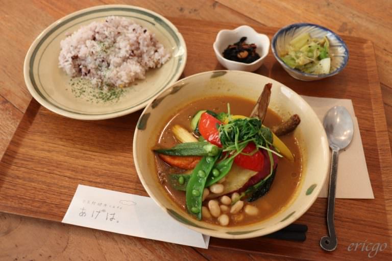 我選擇的就是AGEHA あげは的招牌餐點,精選14種野菜的咖哩飯。如果覺得單純野菜可能會有點太過於清淡,真的也很推薦大家來試試這一份咖哩飯。基本上日本咖哩飯都有一定的水準,有點類似北海道湯咖哩的做法,這份咖哩醬汁非常清爽。我是個蠻愛吃蔬菜的人,蕃薯、紅黃椒、秋葵、碗豆、玉米吮、小豆苗、牛蒡等等,豐富的蔬菜種類我覺得新鮮又好吃!