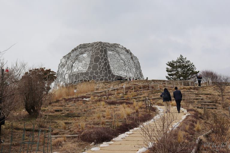 「自然體感展望台 – 六甲枝垂」名字非常有特色,知名建築師三分一博志擅長融合大自然地景,網狀結構設計真的跟一般的展望台完全不一樣,展望台本山就是一件建築藝術品。遠遠看就像一顆蜂窩,仔細走進才會發現,外表剛硬包覆的是溫潤木材的中心平台。實在很可惜這天的天氣不好,想像藍天襯托下的六甲枝垂線條一定會更美!
