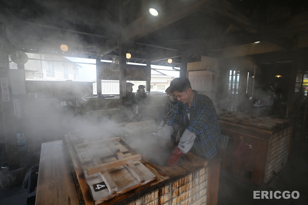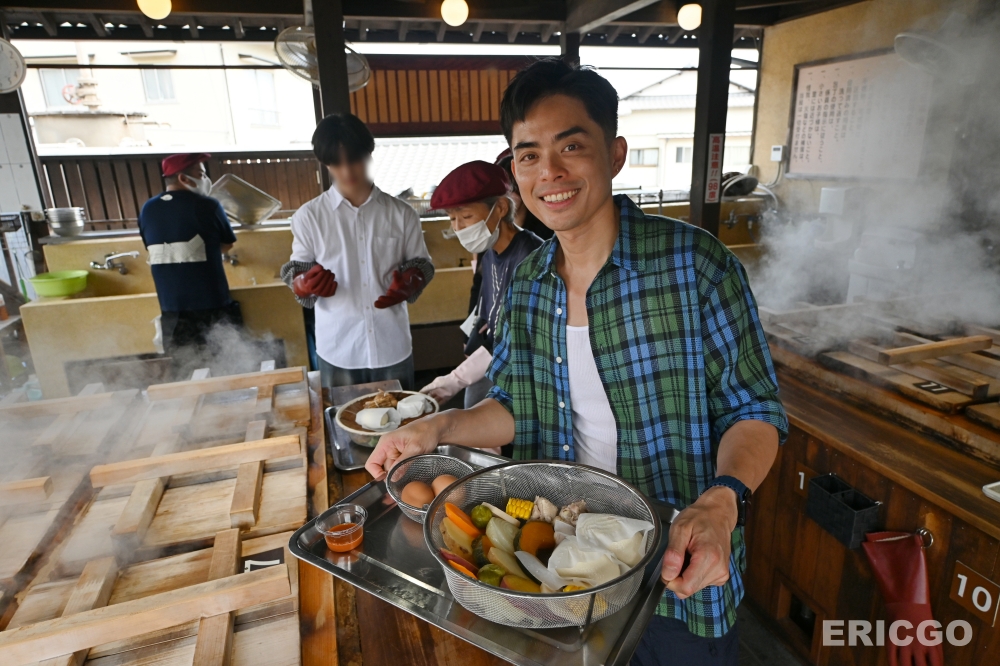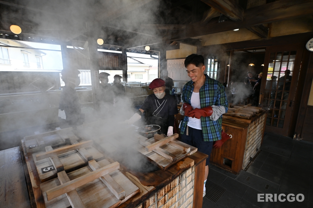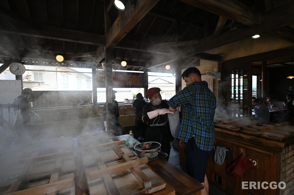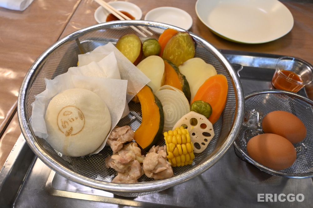 親手操作地獄蒸釜蠻好玩的!雖然蒸汽溫度很高,但工房的設計非常安全,工作人員也會在一旁指導。將食材放入蒸籠,到小心翼翼地放入滾燙的蒸氣釜中,再到時間一到取出,每一步都充滿了參與感跟儀式感。當打開蒸籠,熱氣騰騰的食物香氣撲鼻而來時,那份成就感與美味,是一個大人小孩都能樂在其中的活動。