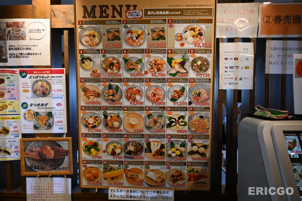 2. 選擇食材:利用自動點餐機,自助點餐。這裡有各式各樣新鮮的海鮮、肉類、蔬菜、溫泉蛋,以及當地特產等等,可以根據個人喜好自由搭配,也可以選擇店家搭配好的套餐。我個人推薦這個什麼都有的2人份「地獄蒸玉手箱」日幣2300。另外還要收地獄蒸鍋的使用費用:小400日幣/大600日幣。