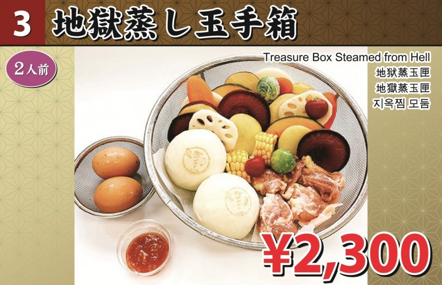 對於初次體驗地獄蒸的朋友,我強烈推薦點選「地獄蒸玉手箱」日幣2300!這是一個非常豐富的組合套餐,內含多種精選食材,如雞肉、包子、玉米、地瓜、高麗菜、溫泉蛋等,讓你一次品嚐到地獄蒸的精髓。雖然是兩人份,不過我覺得份量只夠我自己一個人享用哈哈哈,或是非常適合兩個小朋友。