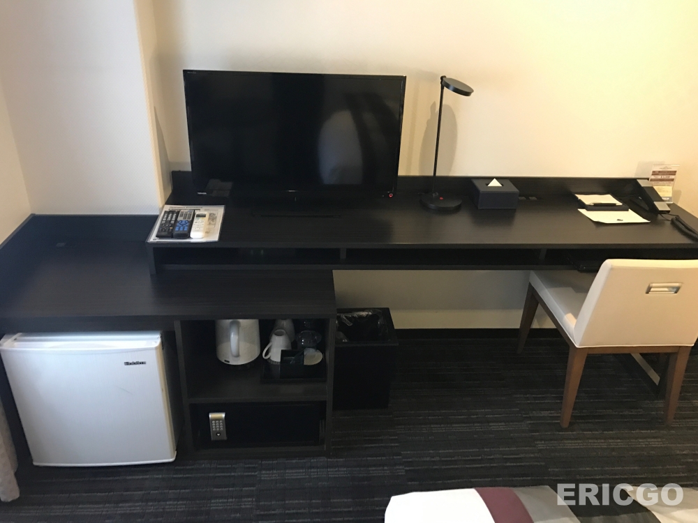 氣氛商務取向,也帶點溫馨的家居感覺,房頭兩邊都設有插座跟置物空間,可以放手機充電!黑色的書桌相當簡潔有型,下方有冰箱、保險箱、熱水壺,大面積的平台沒有多餘的東西,多出很多置物空間! (Agoda房價查詢)