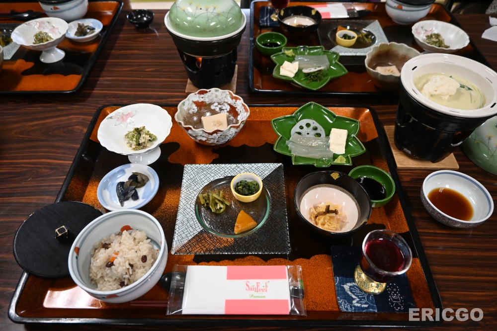 不只住宿,也可以品嚐特色美味的「精進料理」。「精進料理」指的就是素食料理,其核心理念是「不殺生、不浪費」,並透過食材本身的美味與烹調的用心,達到身心淨化的目的。山樂荘的精進料理,完全不使用肉類、魚類及五辛,而是以當季的蔬菜、豆製品、菇類等天然食材,結合精湛的烹調技巧,呈現出食材最純粹的風味。每一道菜餚都如同藝術品般精緻,色彩搭配和諧,擺盤講究,讓人光是視覺就已得到滿足。