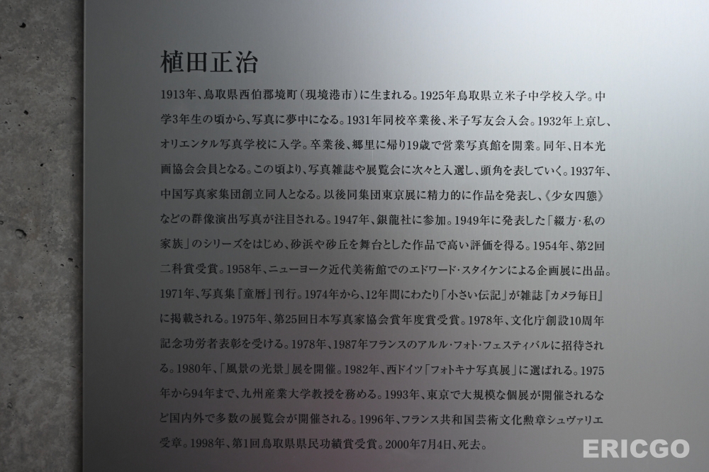 根據館內的介紹,1913年,出生於鳥取縣西伯郡境町(現境港市)。 1925年進入鳥取縣立米子中學。 從初中三年級開始,就沉迷於攝影。 畢業後回到家鄉,19歲開設了營業照相館。 從這時候開始,陸續入選了攝影雜誌和展覽會,展現了嶄露頭角,以《少女四態》等作品照片備受關注。 1949年發表的一系列以沙灘和砂丘為舞臺的作品獲得了很高的評價。 1958年,在紐約近代美術館展出。 1971年,寫真集《童歷》出版,從1974年開始,歷時12年,「小傳記」刊登在《相機每日》雜誌。1975年,獲得第25屆日本攝影師協會獎年度獎。1978年,獲得文化廳成立10週年紀念功勞者表彰。1987年被邀請參加法國阿爾勒攝影節。1980年,舉辦了「風景的景象」展。從1975年到1994年,擔任九州產業大學教授。1993年,在東京及國內外舉辦了大規模舉辦了大量展覽會。 1996年,榮獲法蘭西共和國藝術文化勳章騎士勳章。 1998年,獲得第1屆鳥取縣縣民功績獎。 2000年7月4日,逝世。