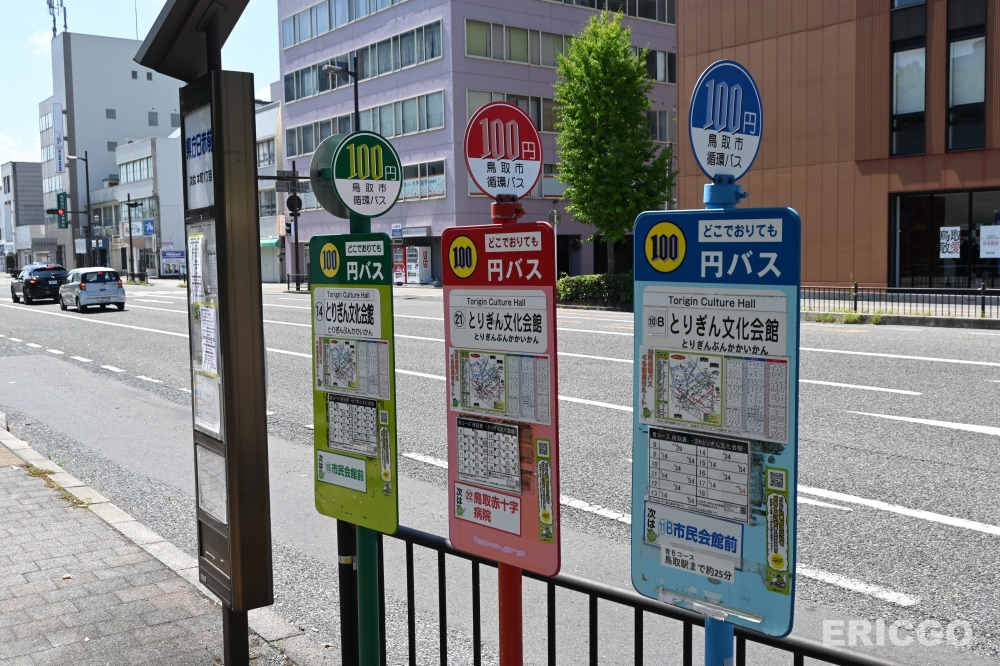 可以利用鳥取市區的循環巴士,只要日幣100,搭到「とりぎん文化会館」就到了。