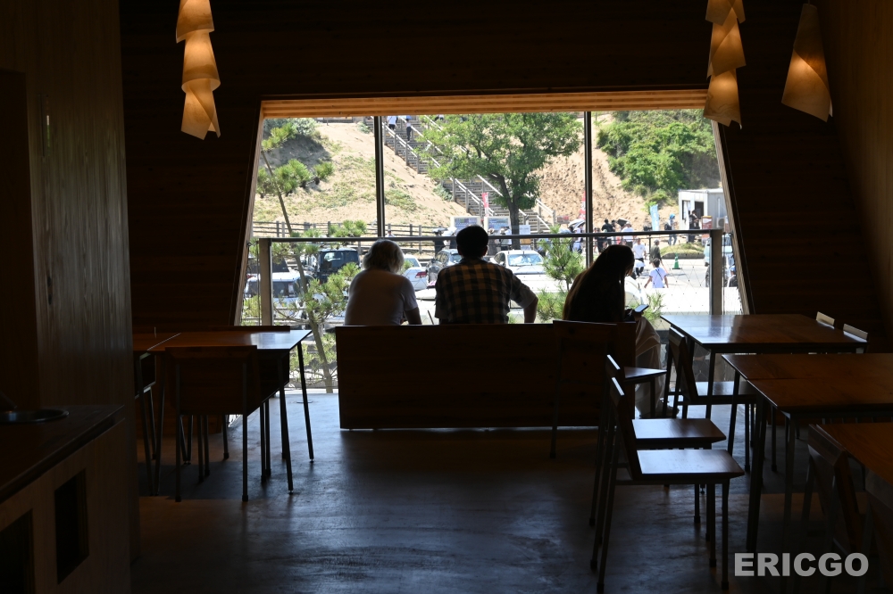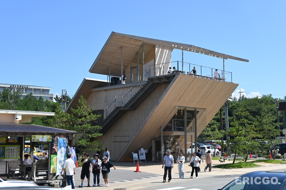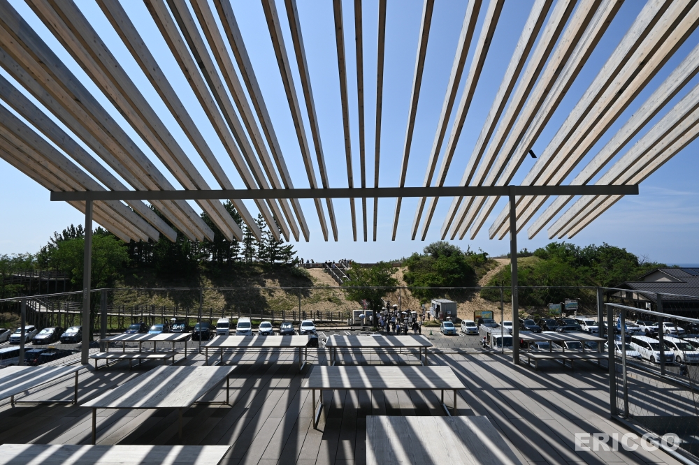 高濱咖啡廳的設計,就是要讓你能以最棒的視角欣賞鳥取砂丘。建議可以選擇靠窗的位置,或是如果沒這麼熱,特別推薦頂樓座位,屋頂的設計也獨具匠心,採用流線型結構,彷彿是砂丘起伏的延伸,讓建築物本身就成為一道風景線。