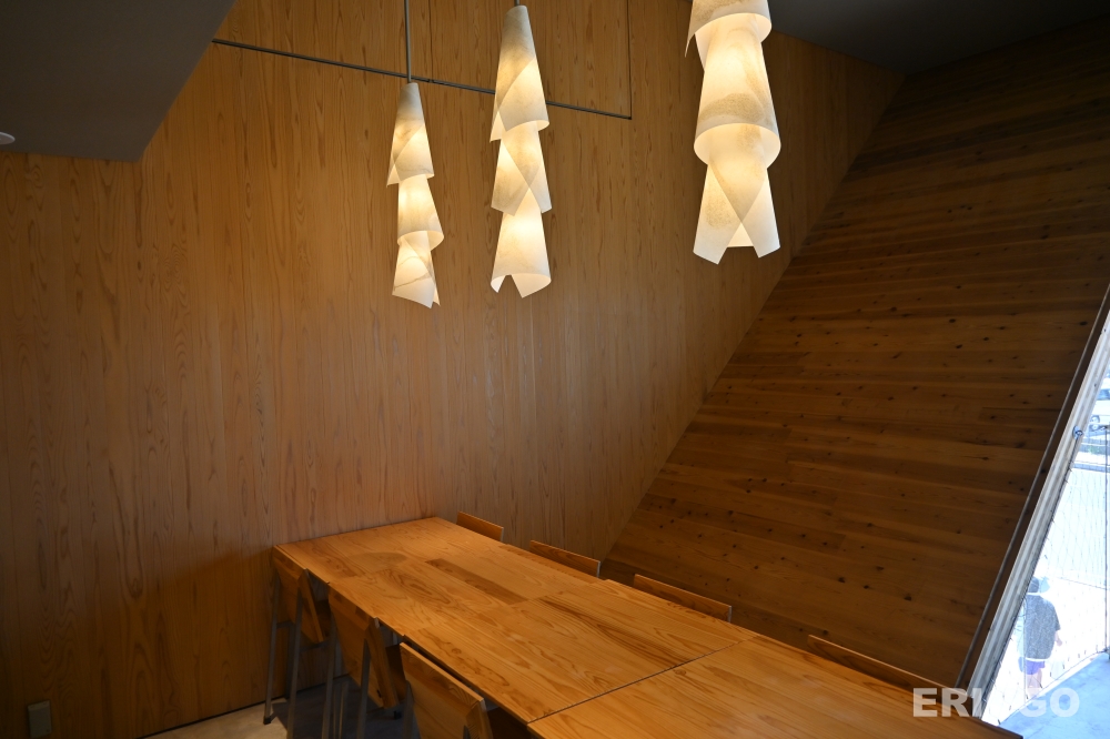 隈研吾先生講究的空間營造也體現在照明上。全部是原創製作的照明,使用鳥取縣的和紙,表面裝飾著鳥取沙丘的沙子,散發著個性柔和的光芒。