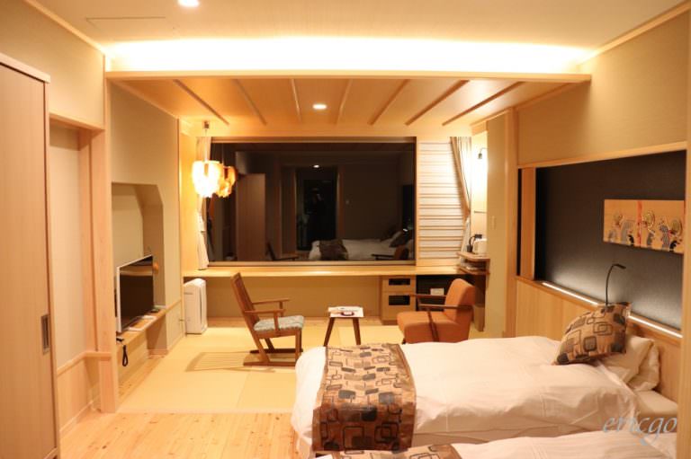 推開房門我就忍不住微笑了!這次入住的房型是2018年春天才全新改裝的海景和洋房(另外還有露天風呂房、和式、多人房等等,更多房型可參考官網),除了有榻榻米的和式空間外,還有洋式的兩張床,和洋室的房型是我個人相當喜歡的風格,日式傳統和風及現代感兼具。(agoda優惠房價查詢)