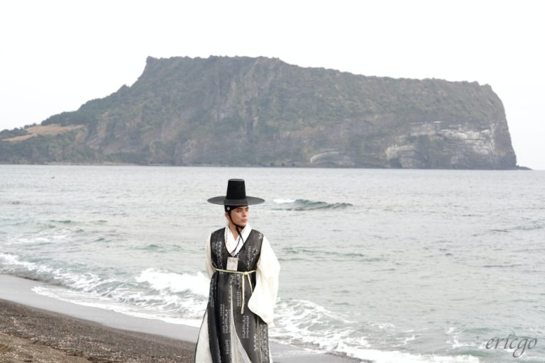 換上全套韓服,氣勢完全不一樣!我選擇來到濟州島知名的自然文化遺產「城山日出峰」附近的광치기해변海灘拍攝,城山日出峰是濟州島東端的火山丘,是韓國第一個自然遺產。這次的照片身後的城山日出峰剛好一起入鏡,是個非常棒的拍攝景點。