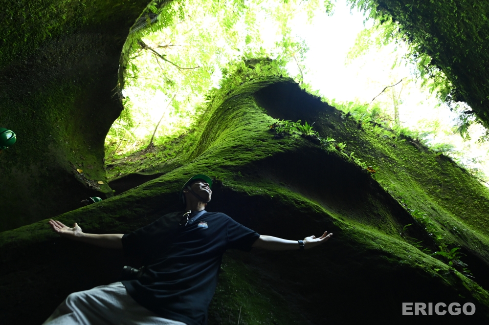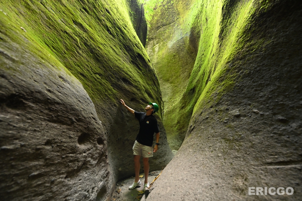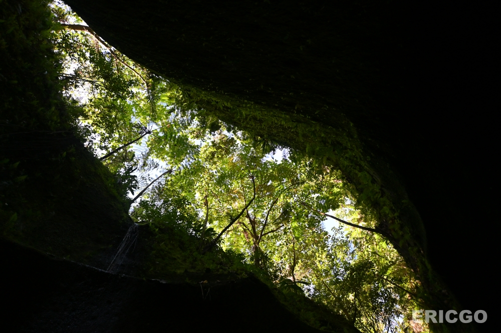 陽光從頭頂的縫隙灑落,形成一道道超現實的光束,上演著一場綠色光影秀。這裡的岩石紋理獨特,經過長年累月的風化與水蝕,形成了如同藝術品般的線條,彷彿置身於《阿凡達》電影中的潘朵拉星球。