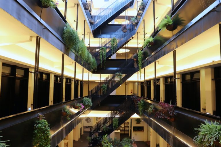 穿過大廳來到路得行旅國際青年旅館中庭,又是另一個截然不同的建築空間,保留原建築結構同時打開天井,讓空氣及陽光流動在建築之中並添加綠意植栽,彷彿讓老建築再次呼吸活了起來。(agoda 優惠房價查詢)