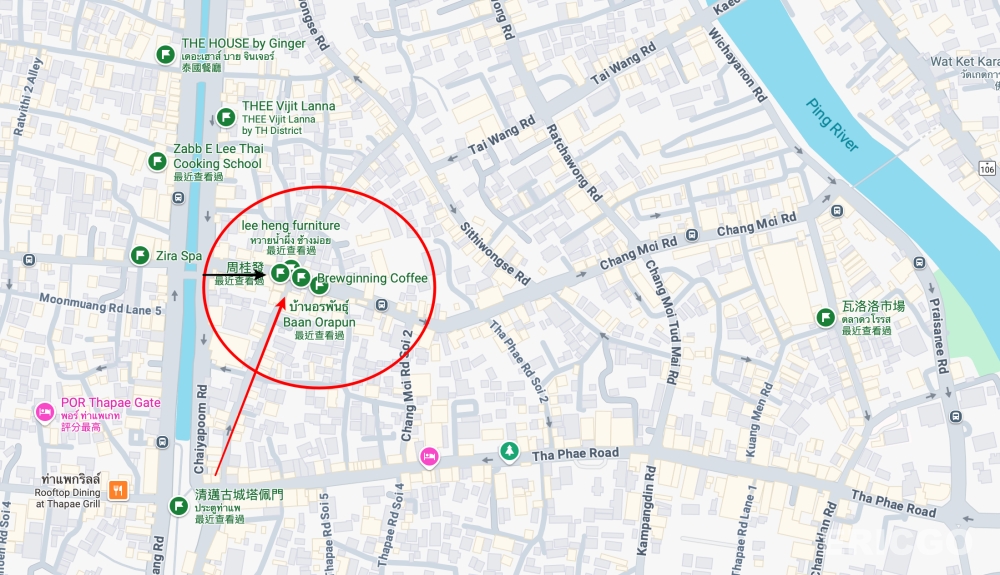藤編一條街主要的店家集中Chang Moi Road(黑色箭頭)跟Chang Moi Kao Road(紅色箭頭)這個路口,沿著Chang Moi Road上其實也還有蠻多店家可以沿途逛逛。下圖中標誌的THEE VIJIT LANNA Hotel、The House by Ginger米其林推薦餐廳、Zira SPA 都在附近,也可以參考看看。