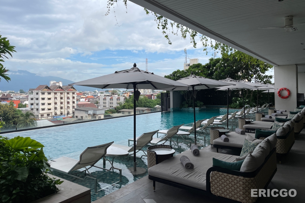 五星級渡假飯店必備的無邊際泳池、健身房、SPA中心位於飯店4樓,雖然不算高但依然可享受俯瞰清邁市區美景,是鬧區中難能可貴的沁涼時分。(優惠房價查詢)