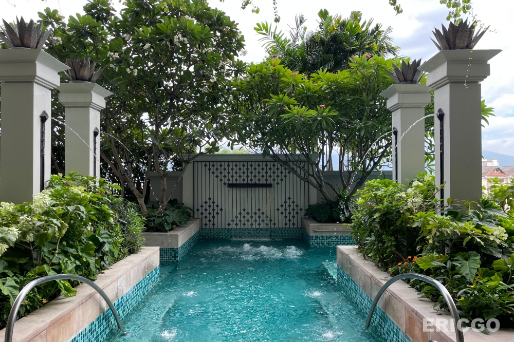 清邁萬豪飯店Chiang Mai Marriott Hotel泳池區造景蠻美的,設有POOL HOUSE池畔酒吧及兒童戲水區。