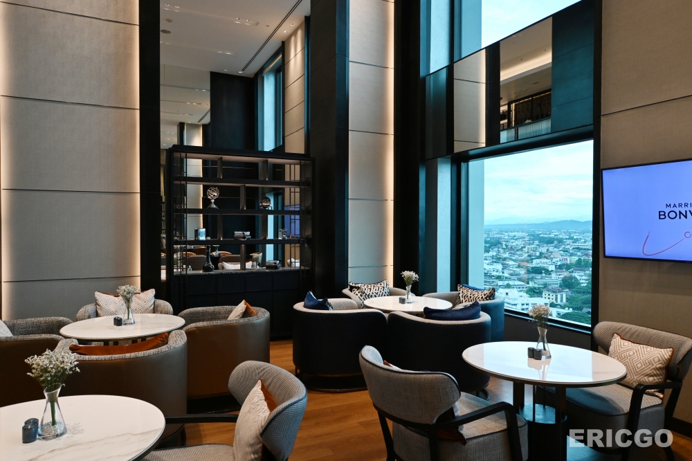 M Club行政酒廊是入住行政樓層套房的客人或高端會員的專屬休閒餐飲空間,提供免費早餐、下午茶、happy hour 等餐飲服務及商務工作空間。 清邁萬豪飯店Chiang Mai Marriott Hotel 的M Club 位於22樓,景色非常棒,當天提早抵達飯店尚未能Check-in就顯在這裡品嚐下午茶跟享受清邁高空美景。(優惠房價查詢)