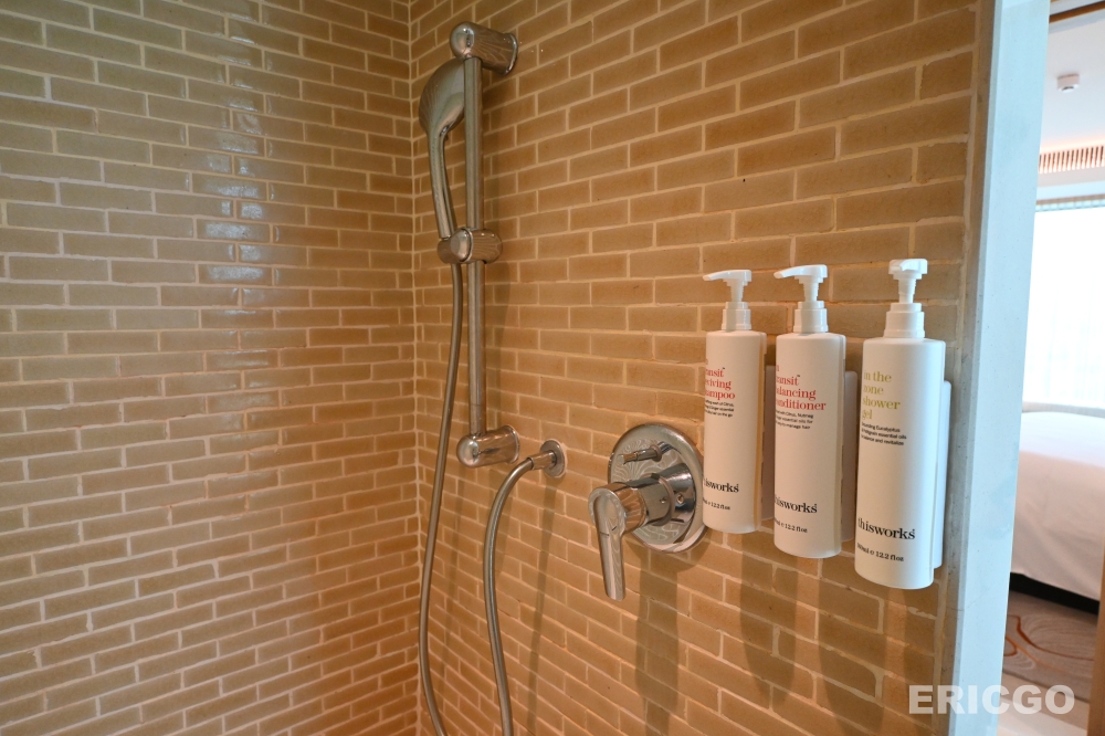 獨立淋浴空間,雙洗手台、超大型泡澡浴缸,浴室內另備有礦泉水。