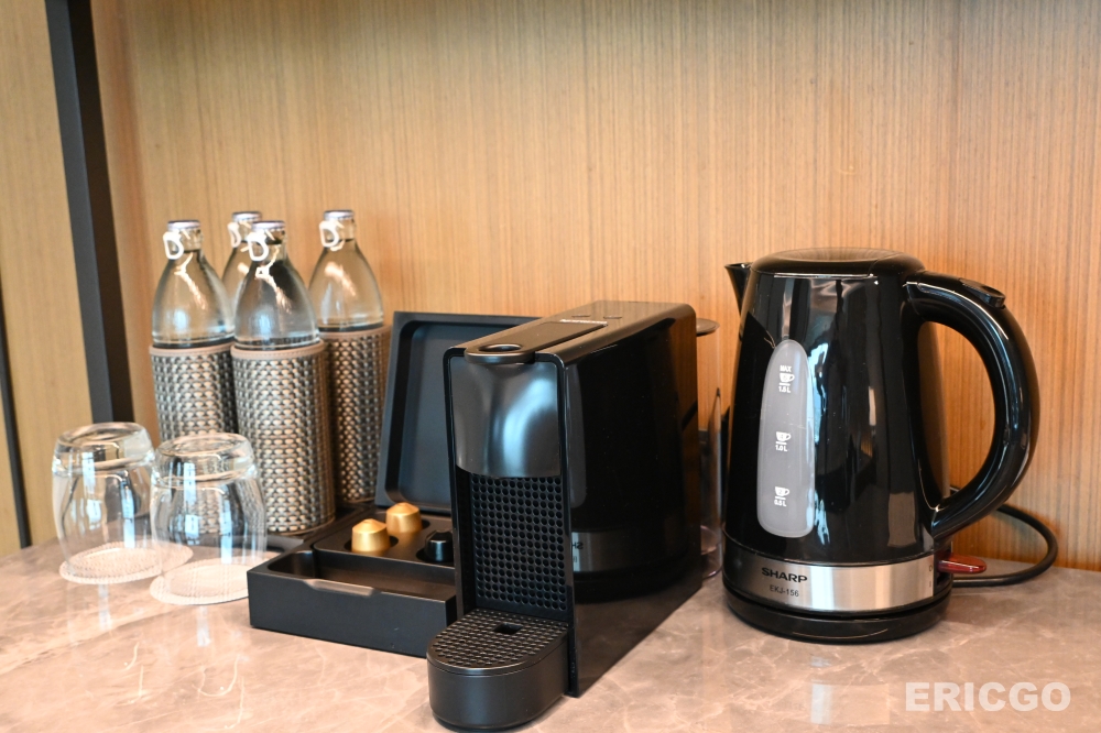 獨立客廳起居空間,大型沙發、電視、茶几餐桌,備有熱水壺、膠囊咖啡機、玻璃瓶裝礦泉水。