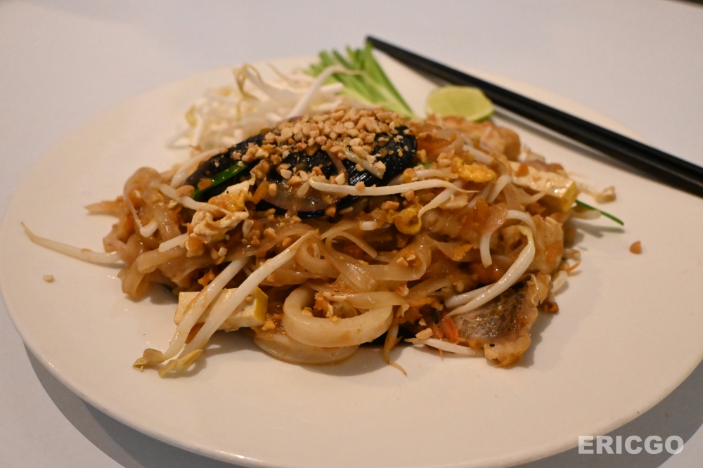 ผัดไทย(ทะเล) (Pad Thai with Seafood) – 170.00 THB:來泰國必點的炒河粉!Lemongrass 的海鮮炒河粉料很實在,有蝦子、花枝等等,麵條Q彈入味,酸甜辣的平衡抓得很好,擠點檸檬汁上去更清爽,味道非常道地。