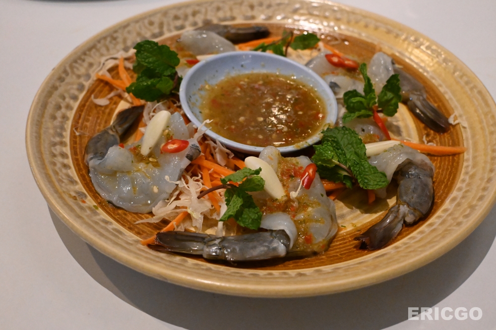 กุ้งแช่น้ำปลา (Raw Shrimp in Fish Sauce) – 225.00 THB:這道泰式生蝦我個人超愛!但我不敢在夜市或路邊裡亂吃,在餐廳才會點來享用!新鮮的生蝦配上蒜片、辣椒、香菜,淋上特製的酸辣醬汁,蝦肉Q彈鮮甜,醬汁更是畫龍點睛,非常夠味,敢吃生食的朋友一定要點!