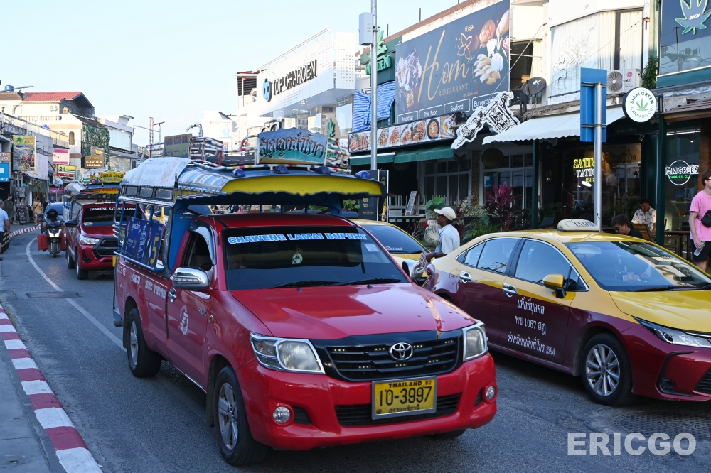 - 雙條車 (Songthaew):紅色廂型車改裝的特色交通工具,招手即停。上車前和司機確認目的地與價格,基本上都是公定的,例如:查汶大街到漁夫村公定價為一人150泰銖。