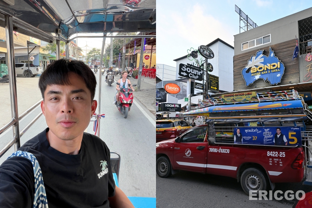 - 雙條車Songthaew: 很有特有的公共交通工具,類似皮卡改裝的巴士。招手即停,上車前先與司機確認目的地及議價,查汶大街到漁夫村公定價為一人150泰銖。