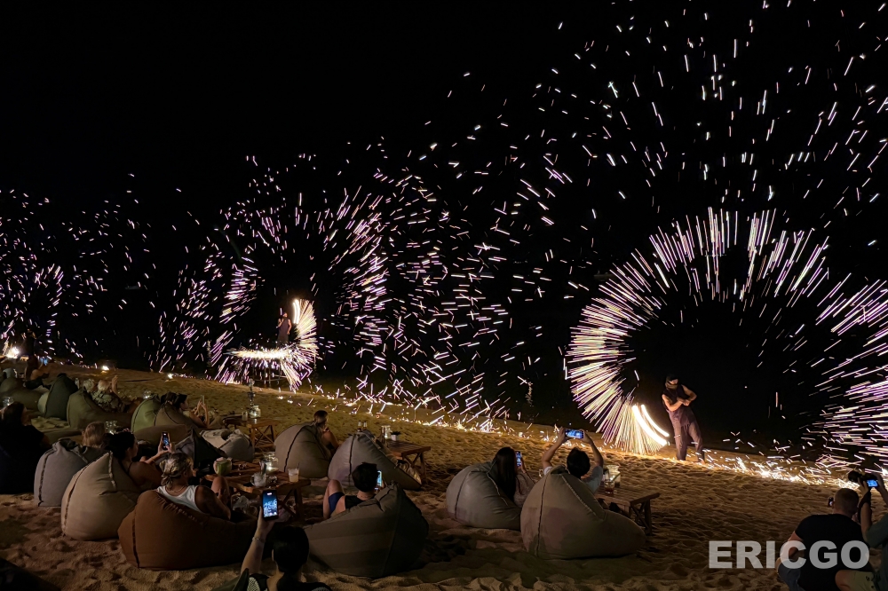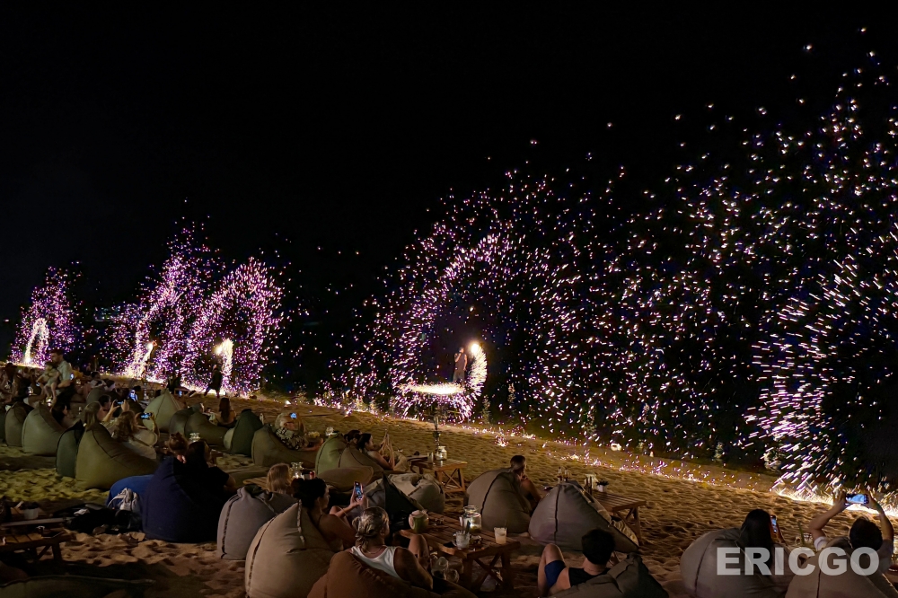 每晚Fire Show 火舞秀有兩場:7:15pm及9pm各一場!從傍晚開始,這裡就聚集了大量人潮,大家或躺在懶骨頭上,或坐在沙灘椅上,手持冰涼飲品,等待夜幕降臨後的精彩演出。