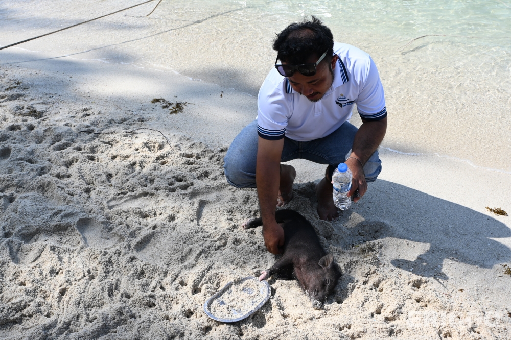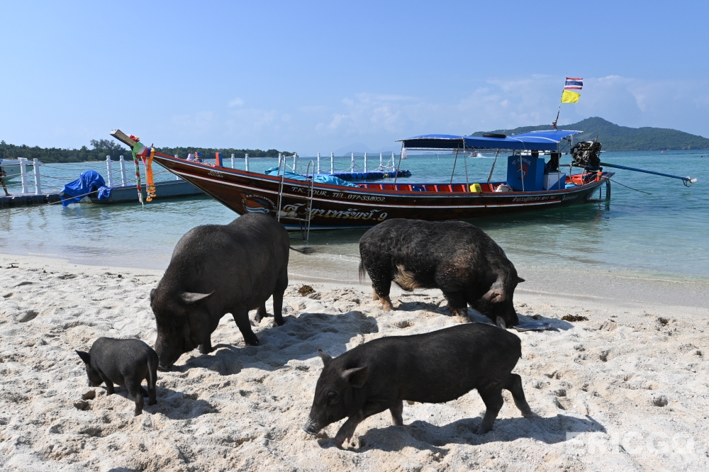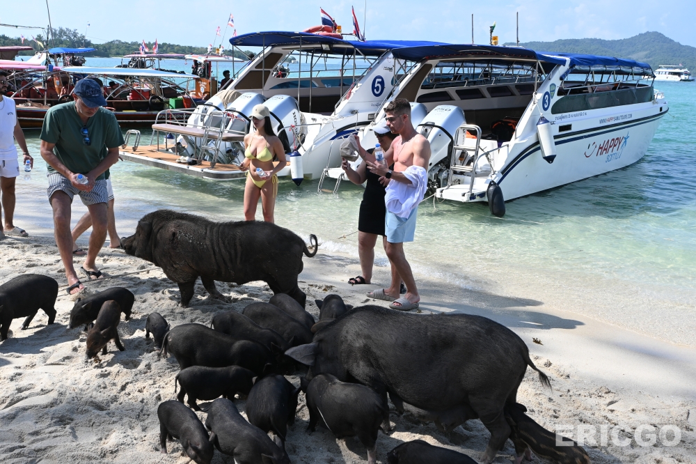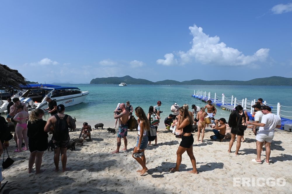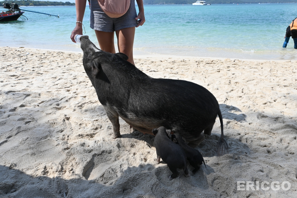 抵達 Koh Madsum 後,會發現島上的豬隻非常親人,牠們習慣了遊客的存在,會自在地在沙灘上漫步、曬太陽,甚至下海玩水。上岸前,工作人員也會簡單說明關於與豬隻互動的規範及注意事項。