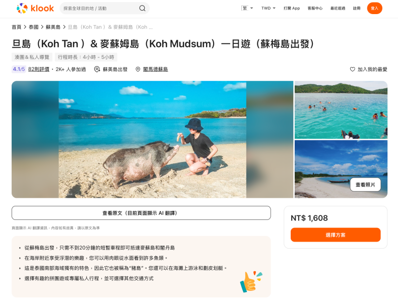 A: 最推薦參加蘇梅島出發的半日或一日遊行程。這類行程通常包含飯店接送、船資、登島費,甚至午餐和浮潛活動,省心又便利。可以透過 Klook平台預訂,選擇多樣且價格透明。 - Q: 在豬島上可以餵食豬隻嗎?有什麼需要注意的?